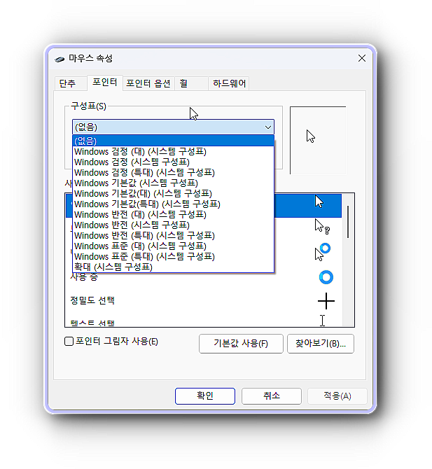 - 변경한 커서가 마음에 들지 않으면 [기본값 사용] 버튼으로 언제든 원래대로 되돌릴 수 있습니다.