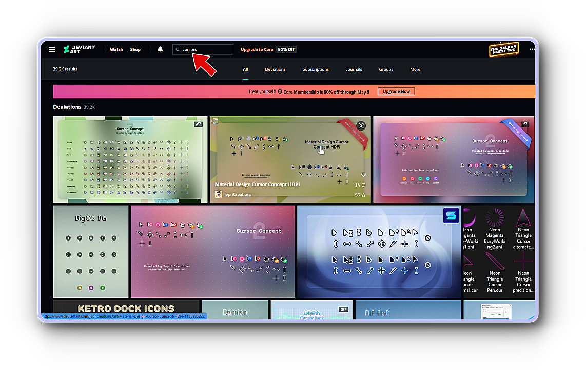 - 데비안아트 검색창에 를 입력해서 커서팩을 찾습니다.