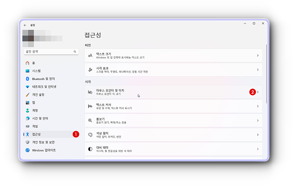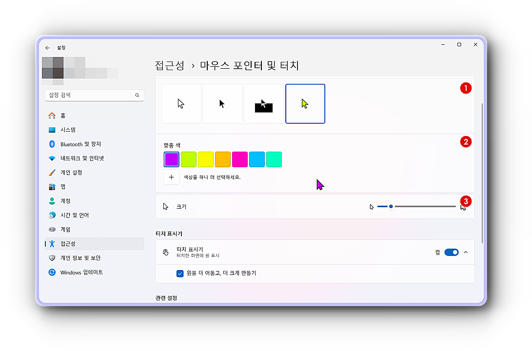 - 색상/크기 변경: 설정 → 접근성 → 마우스 포인터 및 터치에서 조절